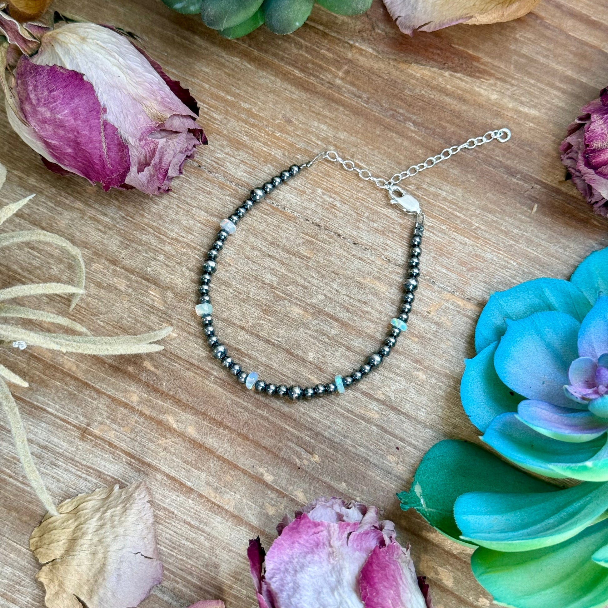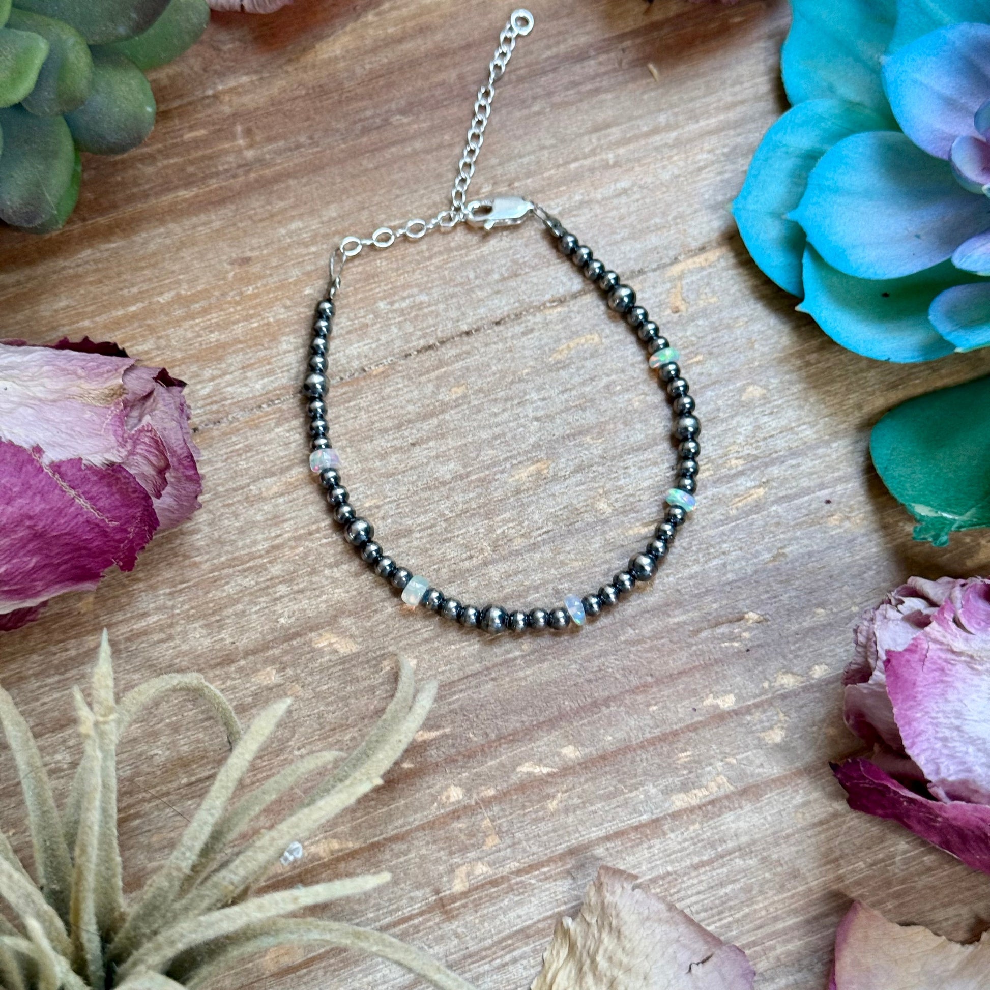 This stunning 6.25 inch White Ethiopian Opal bracelet is handcrafted with natural white Ethiopian opal beads and 3 to 4mm sterling silver pearls, finished with sterling silver findings and a 2 inch added silver extender for adjustable length and comfortable wear. Each opal bead displays its own natural color and soft shimmer, making every bracelet truly one of a kind.
