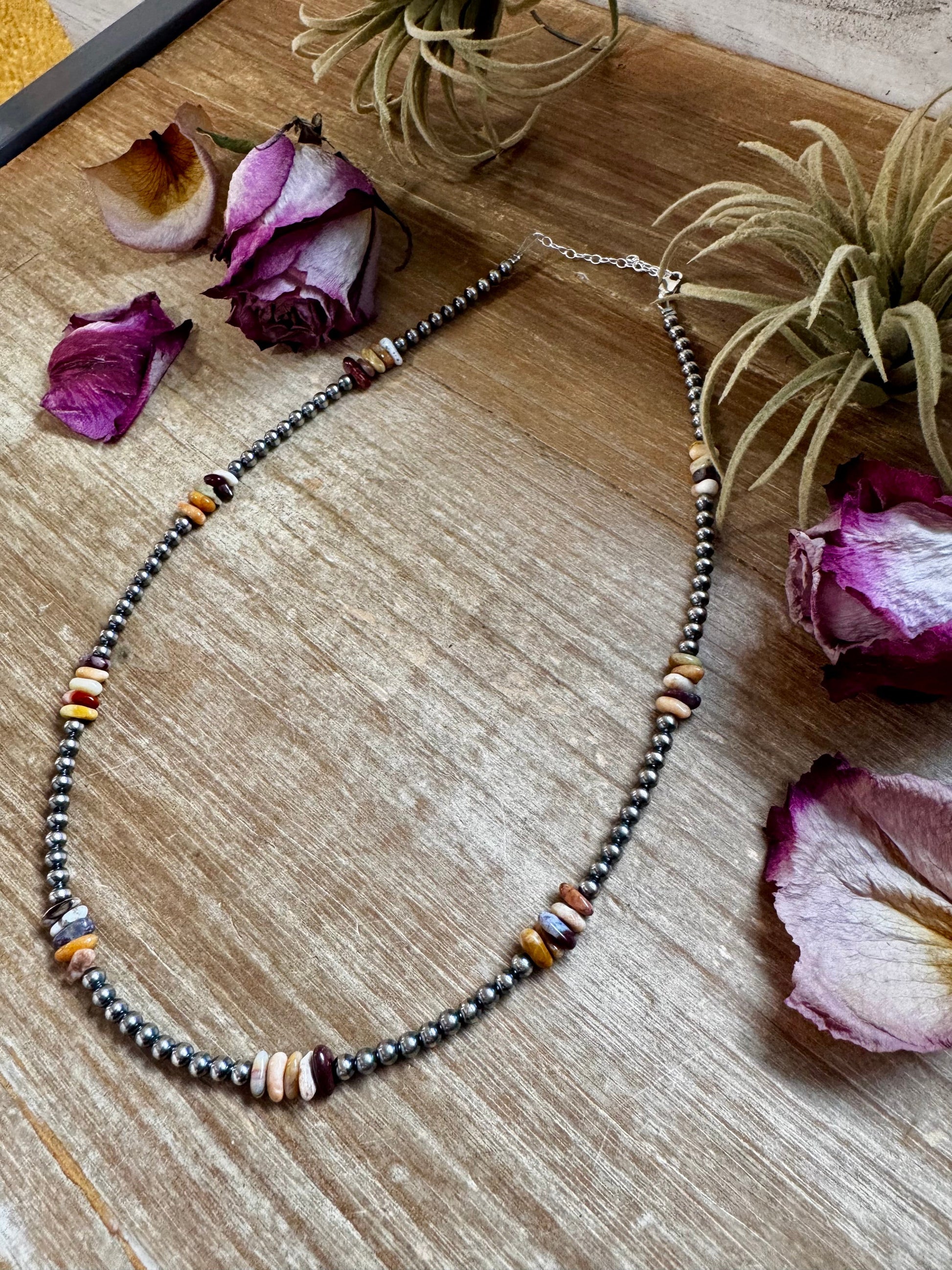 Handmade in the USA by The Bijoux FAB, this necklace blends timeless sterling silver pearls with the natural beauty of Nevada opal nuggets. Crafted with 4mm sterling silver pearls, a sterling silver (.925) chain, and lobster clasp, it measures 19 inches plus extender for an adjustable fit. Each Nevada opal nugget is unique in shape, size, and color, adding character and individuality to every piece. We hand-picked these stones at the gem show in Arizona, making this a truly one-of-a-kind design. Perfect for fall layering or as a standalone statement necklace.